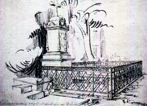 Γ277 Απόστολος Κυρίτσης: Ο οικογενειακός τάφος του Καβάφη στο Σάτμπυ (Αλεξάνδρεια). [Σκίτσο, 1963, στο:] Κ. Π. Καβάφης. Έκθεσις ενθυμημάτων της ζωής και του έργου του, Οργάνωσις «Πρακτορείου Πνευματικής Συνεργασίας», 1973, 8.